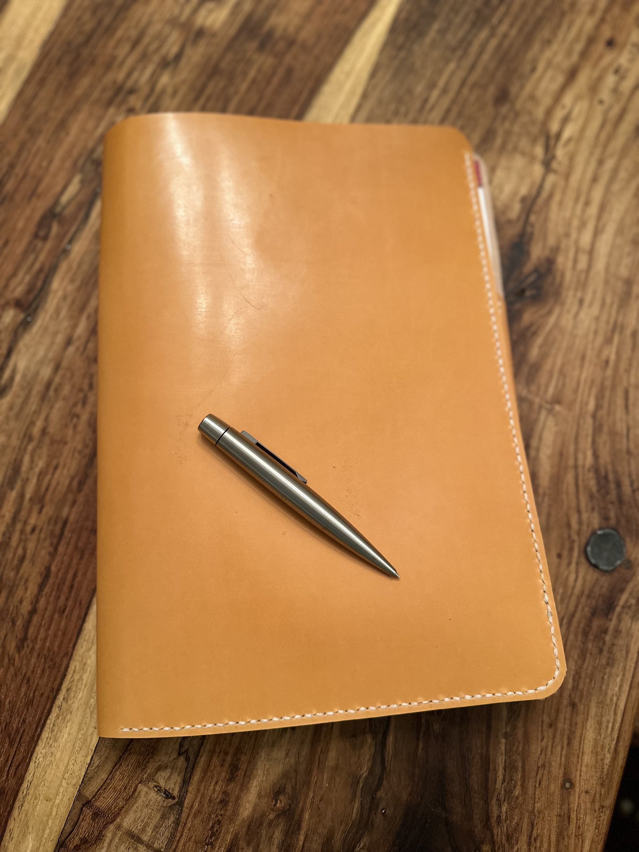 Standard size folio in tan with natural thread, available in a variety of colors and thread choices, with or without a pen slot (shown without). $175-250 ($175 shown, additional pockets & functionality increase the cost slightly). Includes pad.